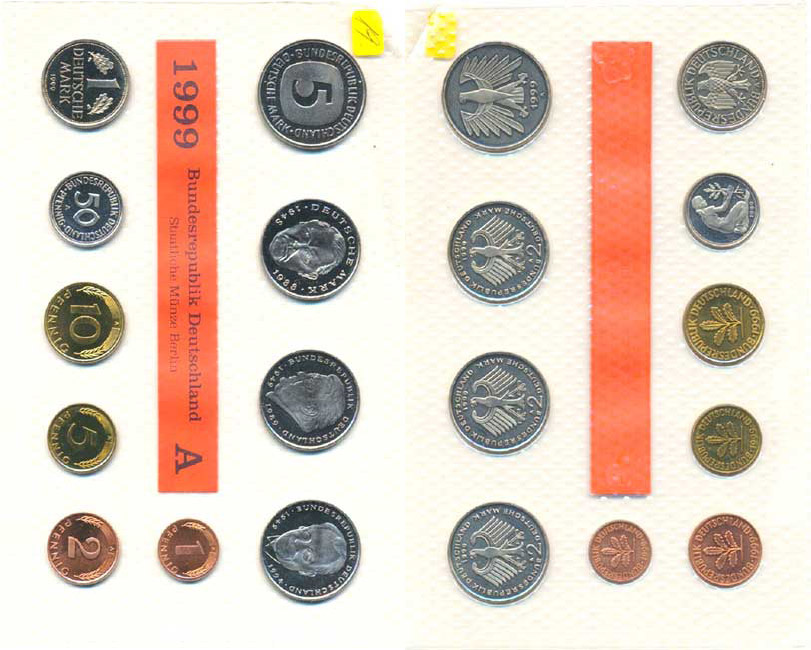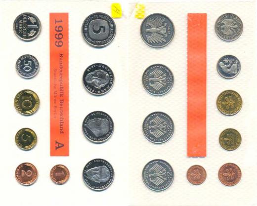 Ročníková sada mincí 1999 minc. A (1, 2, 5, 10, 50 Pf., 1, 5, 2 DM - Eberhart, Strauss, Brandt) 10 ks zataveno v orig. folii mincovny MS 109