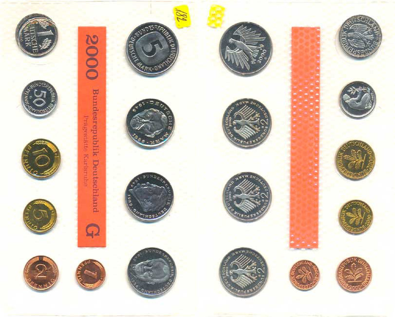 Ročníková sada mincí 2000 minc. G (1, 2, 5, 10, 50 Pf., 1, 5, 2 DM - Eberhart, Strauss, Brandt) 10 ks zataveno v orig. folii mincovny MS 117