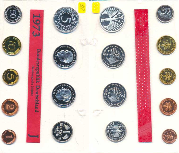Ročníková sada mincí 1973 minc. J (1, 2, 5, 10, 50 Pf., 1, 5, 2 DM - Adenauer, Heuss) 9 ks zataveno v orig. folii mincovny PS 31 "RR"