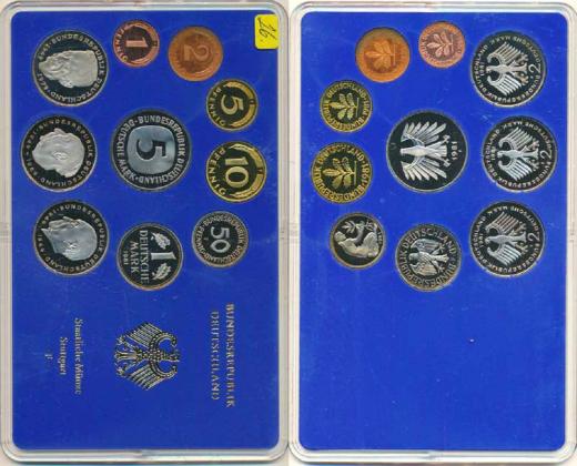 Ročníková sada mincí 1981 minc. F (1, 2, 5, 10, 50 Pf., 1, 5, 2 DM - Adenauer, Heuss, Schumacher) 10 ks v orig. plexi balení mincovny PS 61