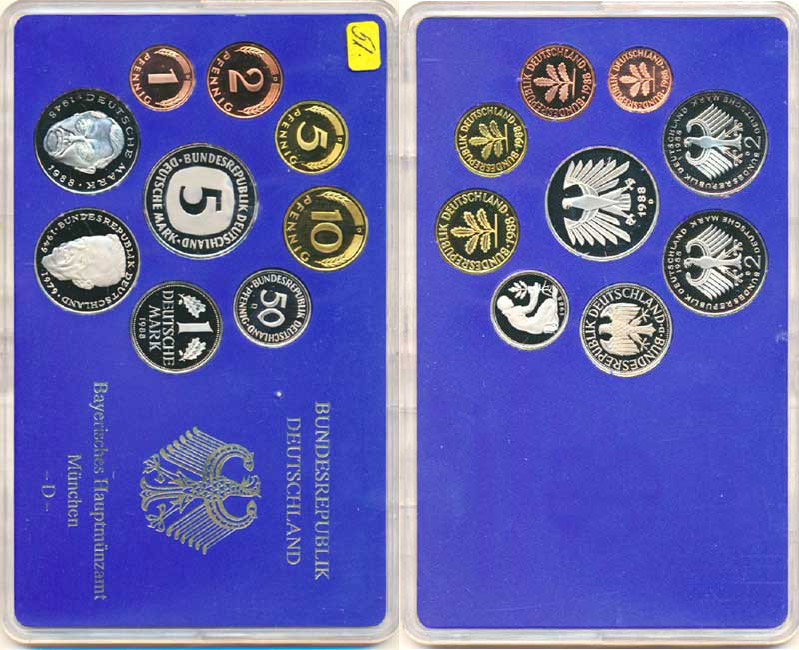 Ročníková sada mincí 1988 minc. D (1, 2, 5, 10, 50 Pf., 1, 5, 2 DM - Erhard, Schumacher) 9 ks v orig. plexi balení mincovn y PS 88