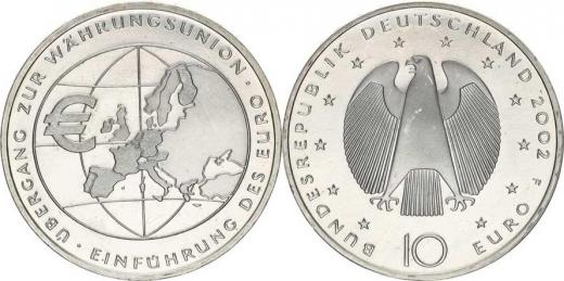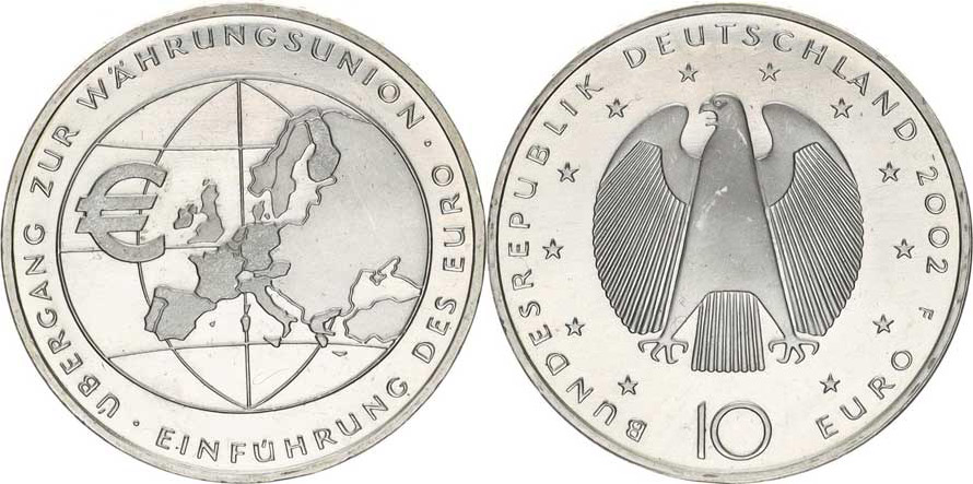 Německo - BRD (1949-), 10 Euro 2002 F - Přechod na Euro měnu Ag 925 18 g KM 215