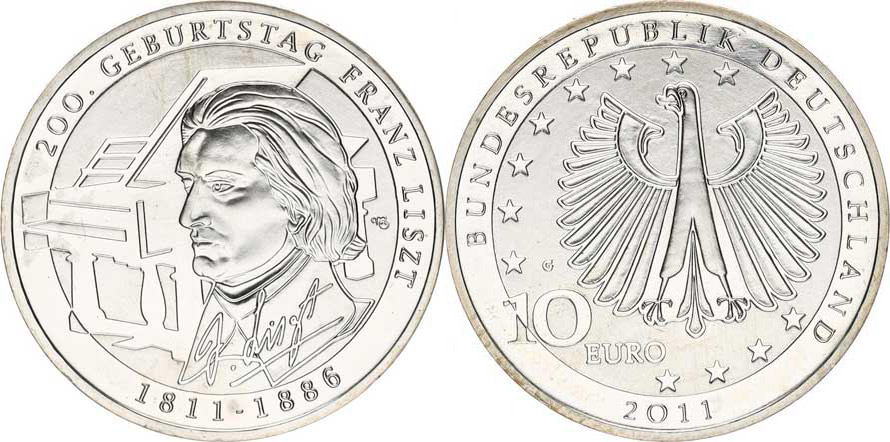 Německo - BRD (1949-), 10 Euro 2011 G - Franz Liszt Ag 625 16 g KM 295