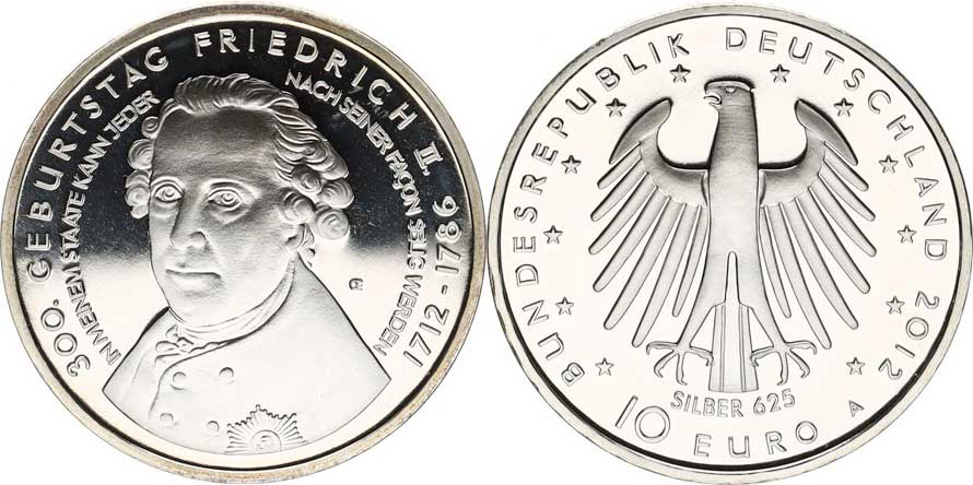 Německo - BRD (1949-), 10 Euro 2012 A - Friedrich II., 300. výr. narození Ag 625 1