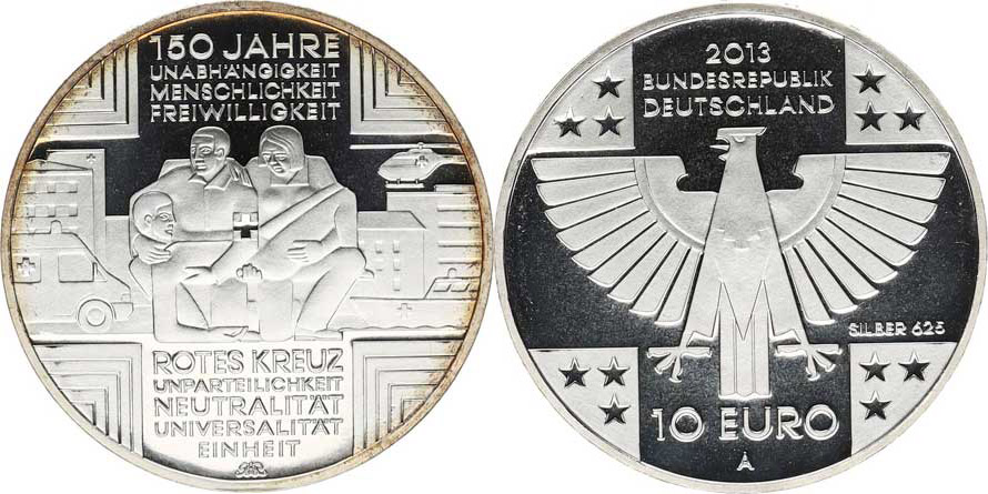 Německo - BRD (1949-), 10 Euro 2013 A - 150. výr. Červeného kříže Ag 625 16 g