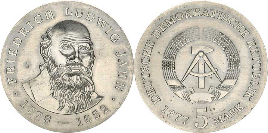 Německo - DDR (1949-1990), 5 M 1977 - Friedrich Ludwig Jahn KM 64 "R"