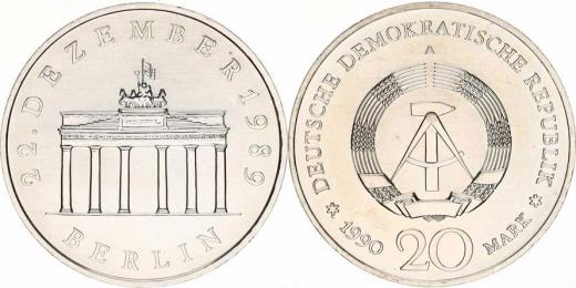 Německo - DDR (1949-1990), 20 M 1990 A - 22.XII. 1989, Brandenburská brána KM 139a A
