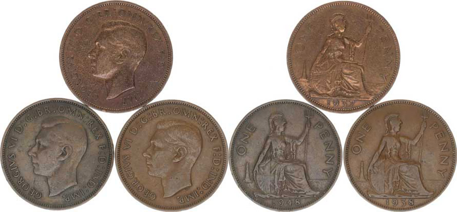 Anglie, George VI.(1936-1952), 1 Penny 1937, 1938, 1948 3 ks