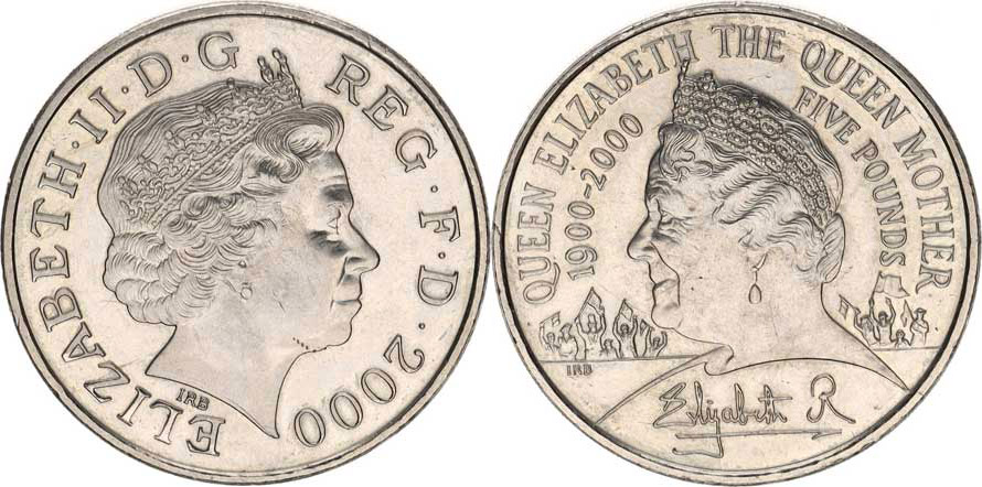 Anglie, Alžběta II. (1952-2022), 5 Pounds 2000 - 100. výr. naroz. královny matky CuNi KM 100
