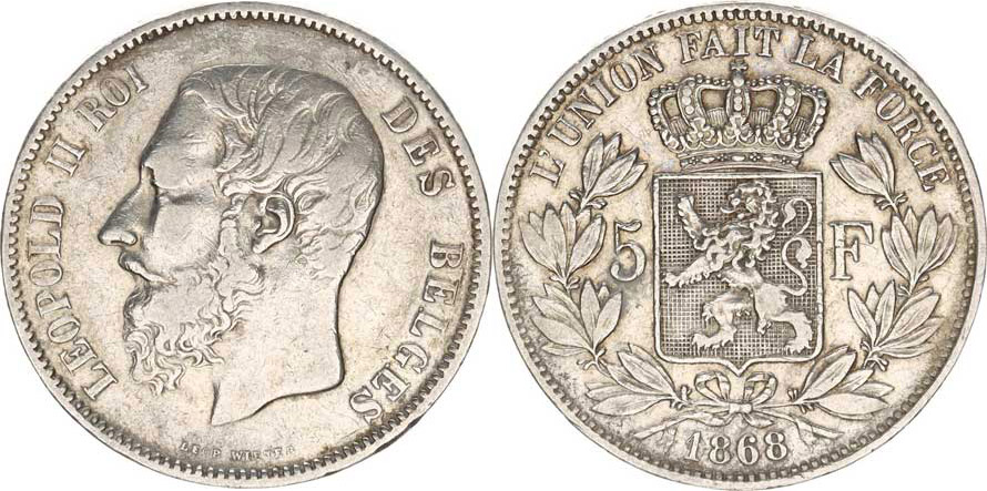 Belgie, Leopold II.(1865-1909), 5 Francs 1868 KM 24 24,717g, tém.