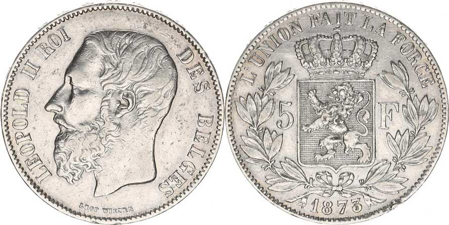 Belgie, Leopold II.(1865-1909), 5 Francs 1873 KM 24, dr. hr.