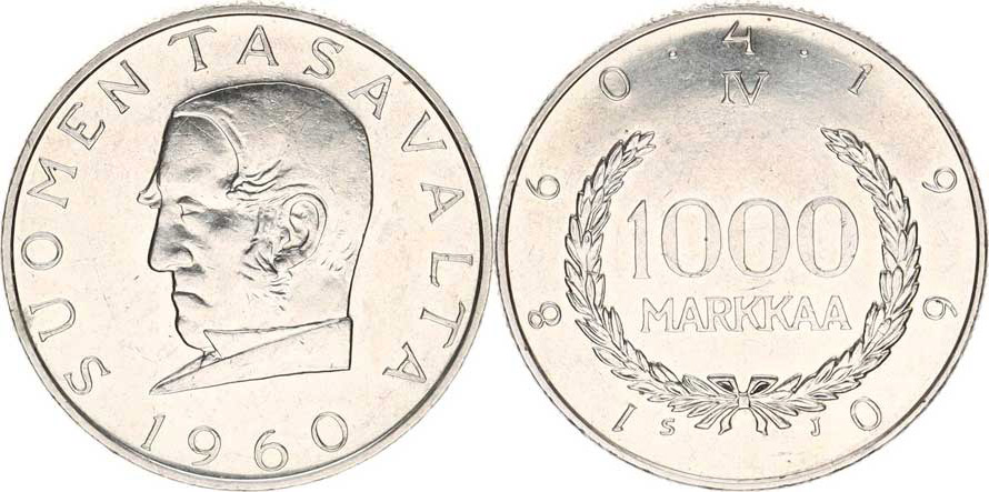 1 000 Markkaa 1960 SJ - 100. výročí KM 43 Ag 875 14,00 g "R"