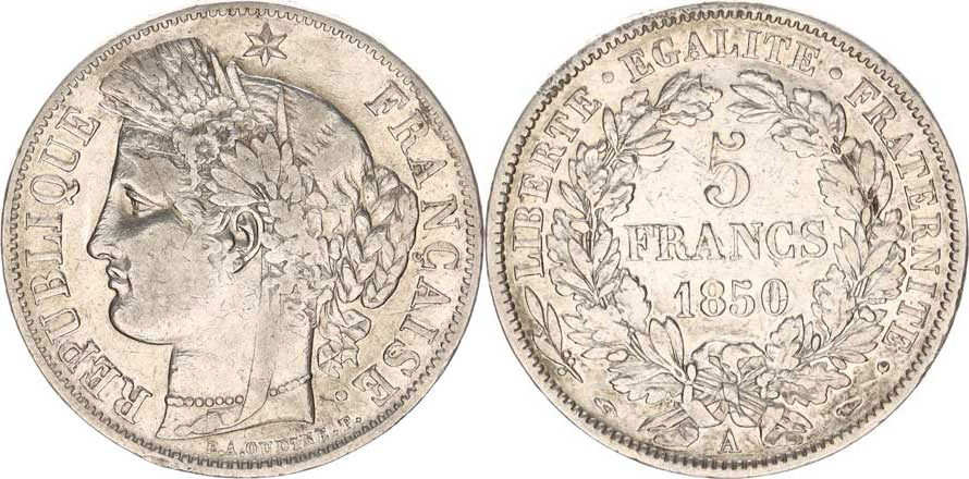 Francie, Druhá republika (1848-1852), 5 Francs 1850 A KM 756,1, úh., rysky