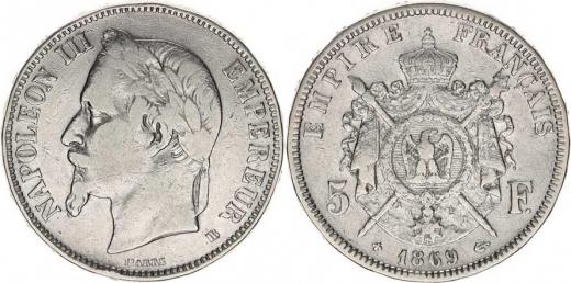 Francie, Napoleon III.(1852-1870), 5 Francs 1869 BB KM 799,2, tém.