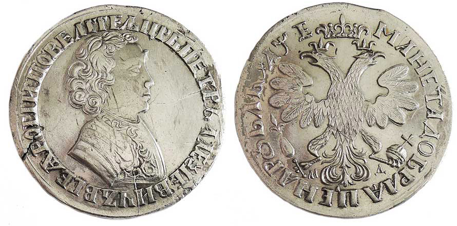 Rusko, Petr I. (1689-1725), Rubl 1705 MD - letopočet psaný cyrilicí NOVODĚL