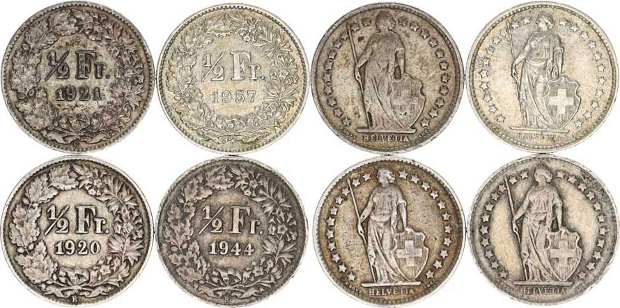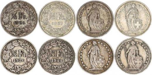 Švýcarsko, 1/2 Francs 1920, 1921, 1944, 1957 vše B 4 ks