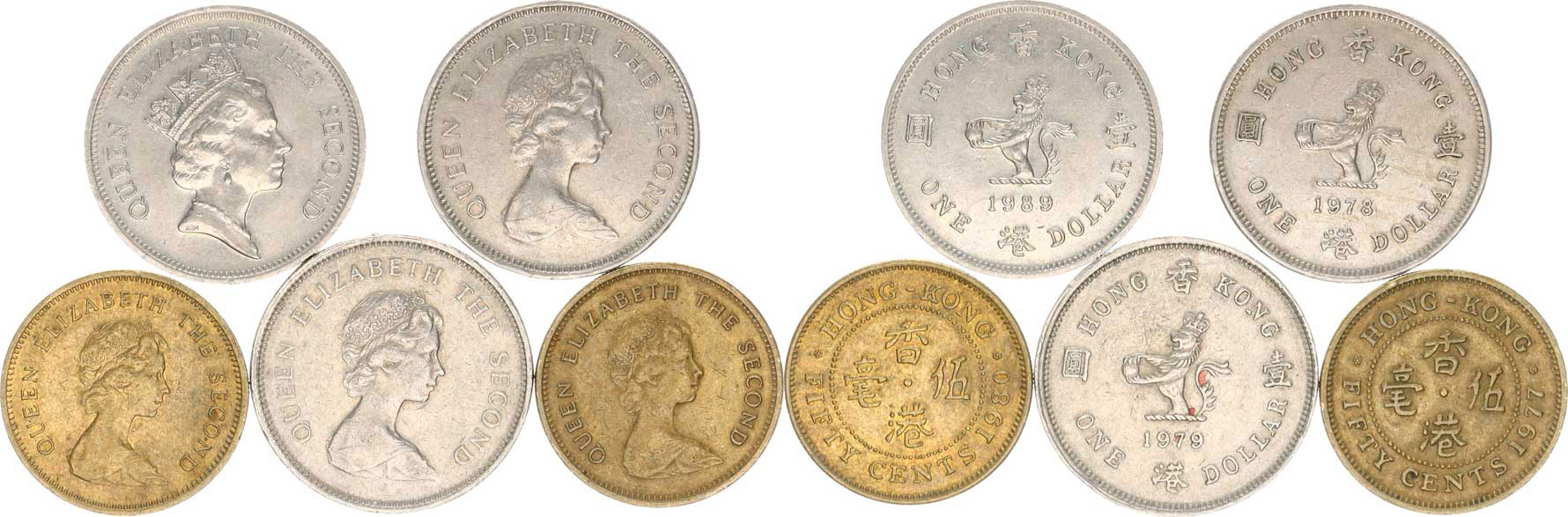 Hong Kong, 1 Dollar 1978, 1979, 1989; +50 Cents 1977, 1980 5 ks