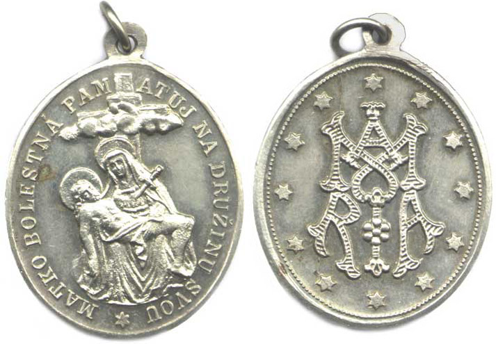 Mariánská družina - Pektorální medaile s českým textem. A: Panna Maria Bolestná (Pieta) pod křížem / R: Mariánský monogram, kolem 12 hvězd alpaka 29x34 mm ploché ouško +závěs, tém.