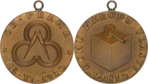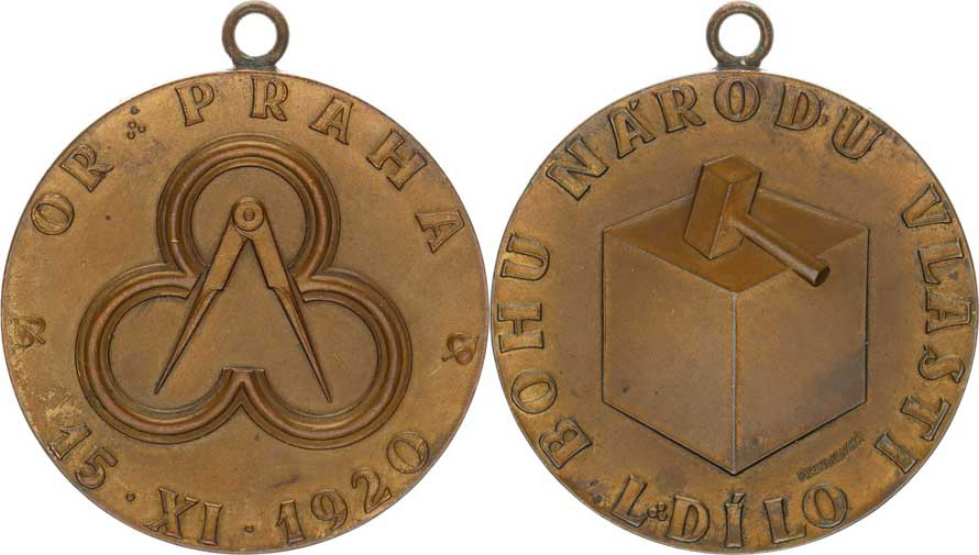Zednářská lóže - OR PRAHA 15. XI. 1920, uprostřed znak, opis / kl adivo na kvádru, opis: BOHU NÁRODU VLASTI - L. DÍLO sign. : Fr endlovský na hr. MINCOVNA KREMNICA bronz 50 mm 44,20 g pův. podélné drátěné ouško