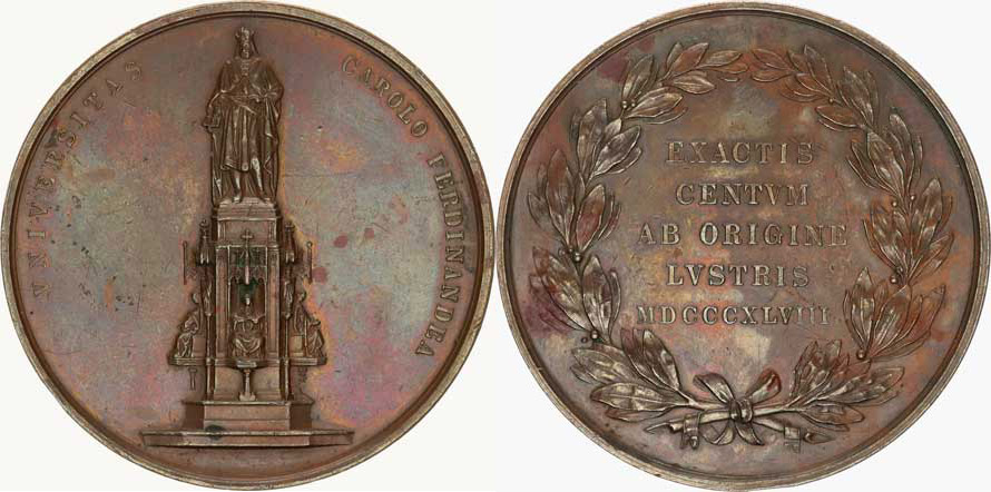 500. výročí založení Karlovy univerzity v Praze 1848, 5-ti řádkov ý nápis / Novogotický pomník Karla IV. bez signatury ! br onz 52 mm NL; Taul 1954, nep. hr.