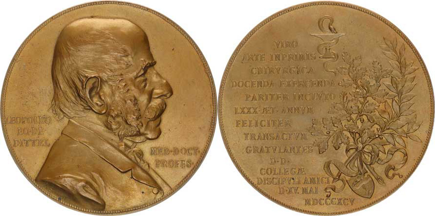 Leopolda von Dittel, profesor urologie Vídeňské univerzity - K 80 0. narozeninám 1895, poprsí zprava, nápisy / 14ti řádk. nápis, du bová a vavřín. ratolest bronz 58 mm 81,12 g