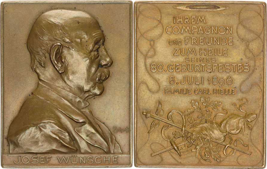 Josef Wünsche, poprí zprava, nápis / K 80. narozeninám v r. 1896 věnuje rodina Carla Hielle, 8-mi řádk. nápis, dole atributy H auser 8013 bronz 33x42 mm 24,84 g