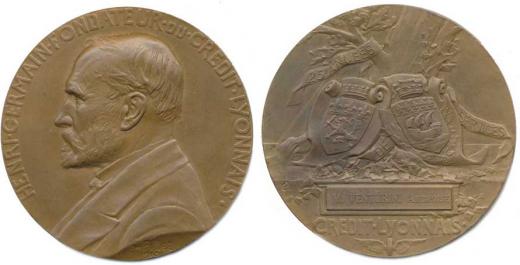 Henri Germain - zakladatel Credit Lyonnais, poprsí zprava, opis / Za 25 let služby, štíty s erby Lyonu a Paříže u kořene stromu, v kartuši věnování: M.VENTURINI Ambroise, níže KREDIT. LYONNAIS sign.: CH. PILLET/ 1910 bronz 81 mm 251 g původní etue