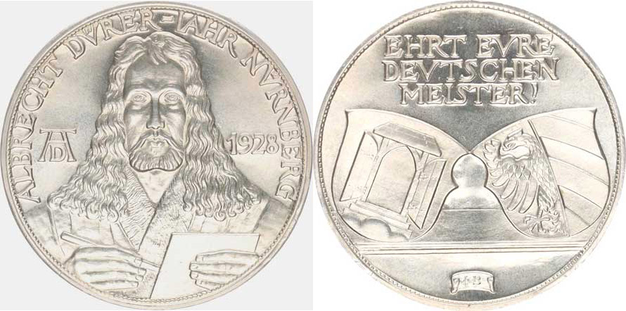 Albrecht Dürer - Jahr Nürnberg 1928, poprsí čelně / nad dvěma ští ty nápis EHRT EVRE DEVTSCHEN MEISTER Ag 900 36,5 mm 25,00 g