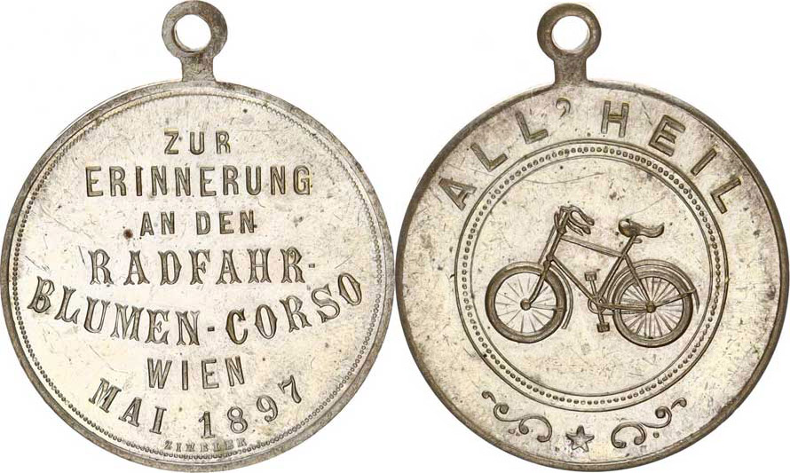 Vídeň - Upomínka na cyklo jízdu po Blumen-Corso 1897, 7-mi řádkov ý němec. nápis / Jízdní kolo v kruzích a nápis ALL´ HEIL sign. : Zimbler stříbřený kov 31 mm orig. ražené ouško