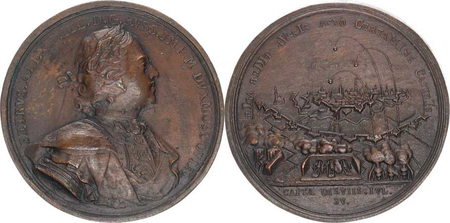 Petr Alexejevič ruský car a kníže moskevský , poprsí zprava / obs azení Rigy, scéna z obléhaní města (1710) Cu galvano 45,5 mm 58,05 g jako Diakov 32.7
