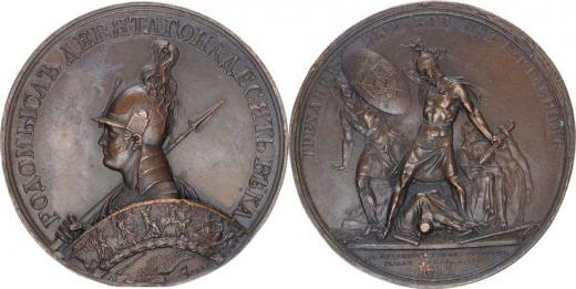 Medaile 1812 podle modelu hraběte Tolstého - Bitva u Krasného voják s kopím a štítem zleva / alegorie bitevní scény sign.: Ljalin 1834 Cu patin. galvano 64,5 mm 158,50 g