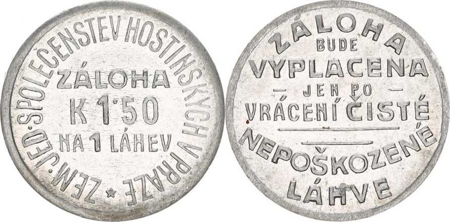 Pivní známka - "Záloha K 1.50 na 1 láhev", Zem. jed. společenstev hostinských v Praze / 7-mi řádkový nápis Al 26 mm