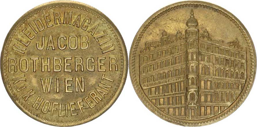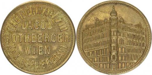Vídeň - Jacob Rothberger, obchodní reklamní známka majitele oděvn ího obchodu a c.k. královského dodavatele. A: Průčelí obchodního domu, bez textu / R: Pětiřádkový německý nápis mosaz 24 mm 5,11 g