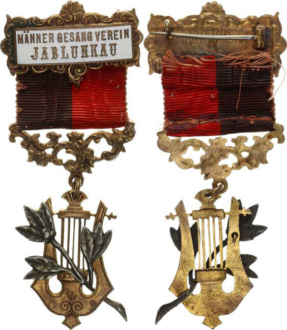Jablunkov - MÄNNER GESANG VEREIN / JABLUNKAU, nápis v bílém smal t. štítku na krátké černo-červené stužce s kov. zakončením a zavě šenou lyrou 40x95 mm