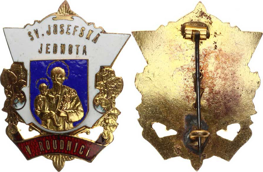 Roudnice - SV. JOSEFSKÁ JEDNOTA, nápis v bílém smaltu, na vyvýšen ém modrém štítu zlacená polopostava sv. Josefa ss Ježíškem, vespo d v červené stuze nápis V ROUDNICI bronz 30x40 mm připínací s ponka