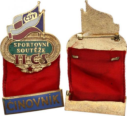 II. CS - "Sportovní soutěže ČSTV" barevný smalt s červenou stužk ou se smalt. štítkem s nápisem ČINOVNÍK 30x38 mm připínací spo nka