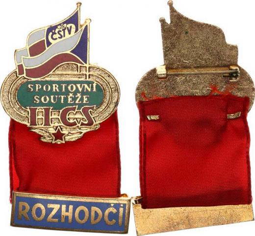 II. CS - "Sportovní soutěže ČSTV" barevný smalt s červenou stužk ou se smalt. štítkem s nápisem ROZHODČÍ 30x38 mm připínací spo nka