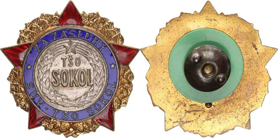 "ZA ZÁSLUHY" - TŠO SÚV SOKOL (Tělovýchovná športová organizácia- slovenský ústredný výbor Sokola) - hvězda - zlacená smalt. bronz 43 mm sign.: MINCOVNA KREMNICA původní etue bez uzávěru