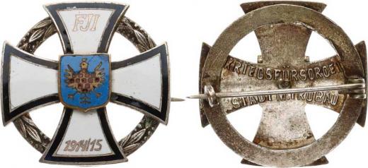 Odznak - "Kriegsfürsorge der Stadt M. Trübau 1914 / 15" (M.Třebov á), na dubovém věnci bílo-černý smalt. tlapatý kříž, uprostřed v modrém štítku městský znak, v horním poli kříže iniciály F.J.I., ve spodním datace 1914/15 30x30 mm zapínací sponka