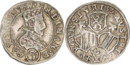 Ferdinand II. - arcivévoda (1592-1618), 3 kr. 1599, Štýrsko Graz "R" KM 15; Her. 88