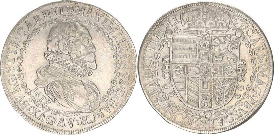 Maximilián - arcivévoda (1612-1618), Tolar 1613, Tyroly Hall - typ datace pod poprsím (1613) Voglh.