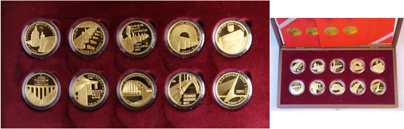 10 x 5 000 Kč - Sada "Mosty České republiky", kapsle, luxusní d řevěná etue +certifikáty