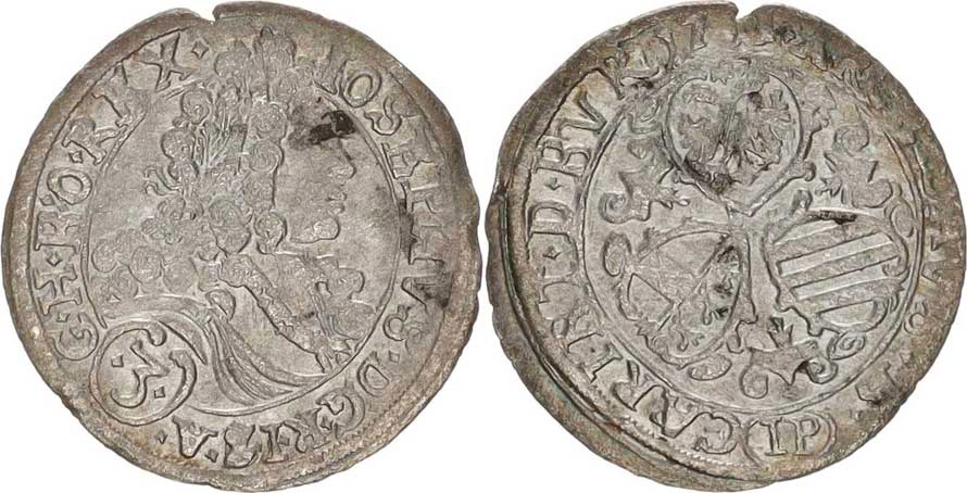Josef I. (1705-1711), 3 kr. 1707 IP, Korutanny - Preiss var.: rozdělovací zn. kosočtve