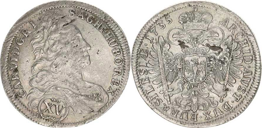 Karel VI. (1711-1740), XV kr. 1735 b.zn., Vratislav "R", dr. vada stř., hr., tém.