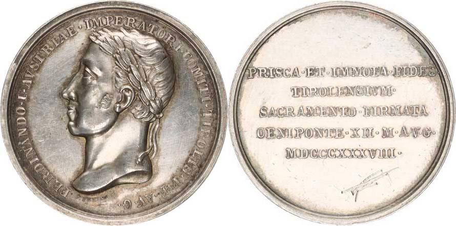 Medaile 1838 na holdování v Tyrolsku - hlava zleva, opis / 5-řádk ový nápis sign.: F.Putinati Nov. F. 1 B; M. 2575 Ag 34 mm 22,203 g_dr. rys.