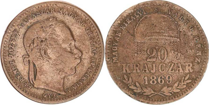 20 kr. 1869 GYF - Cu zkušební odražek Moravec neuvádí 2,054 g