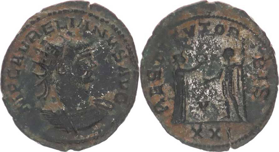 Antoninián, ženská postava podává císaři vavřínový věnec AESTITVTOR BIS, v úseči XXI RIC 3167 3,381 g
