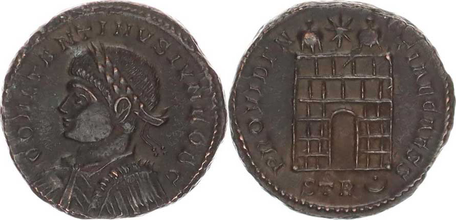 AE 19, hradební brána PROVIDEN TIAECAESS minc. Trier RIC VII 479 3,422 g