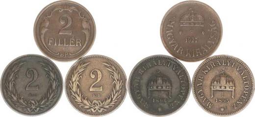 2 Fillér 1895, 1896 oba KB; +Maďarsko - 2 Fillér 1927 BP 3 ks