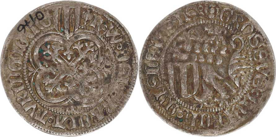 Groš štítový, minc. Freiberg (1451-56), mincm. Nicol Monhaupt Radoměrský 18; Krug 1034/11 2,552 g_v ploše sběrat. zn., tém.